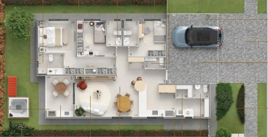 Um dos grandes diferenciais do projeto é o conceito de casas isoladas, com recuo lateral de 1,5m em ambos os lados, garantindo 3 metros de distância entre as residências — mais privacidade, ventilação e conforto acústico.